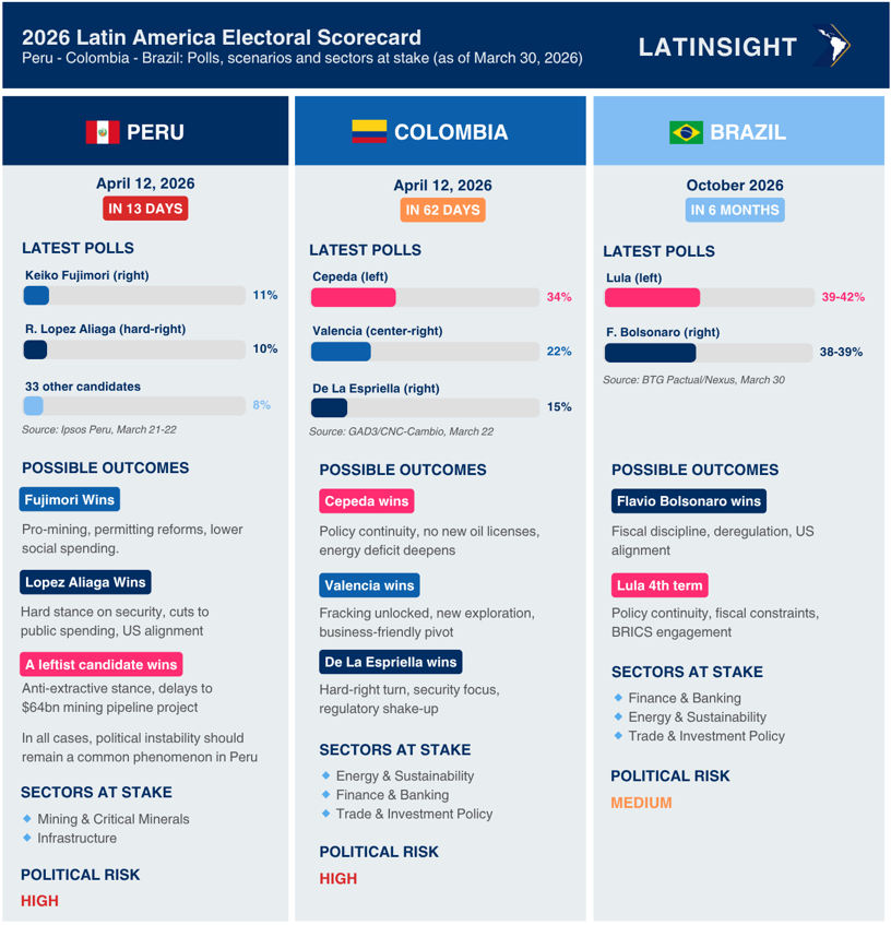 Between April and October 2026, three of Latin America's most important economies will elect new presidents. Peru votes on 12 April, Colombia holds its first round on 31 May and Brazil follows in October. Together, these three countries account for more than 55% of the region's GDP.